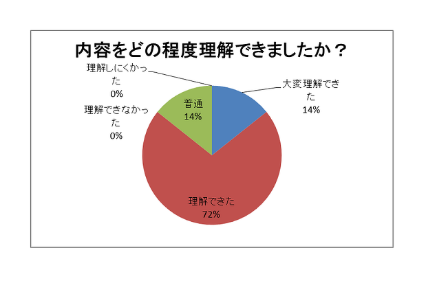 - 問題解決の具体例でダイエットの話は分かりやすかったと思います。講師の説明時間、ワークの時間がもう少しあると良かった。