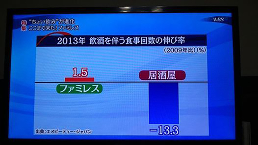 2014年09月20日(土) ブログ “ちょい飲み”ファミレス ファミレスでお酒を飲んで帰宅する、 ってことはまずないなぁ。 でも、世の中では、そういう流れなんですかね。 今のところは首都圏の話かな・・・。 客の立場からすると、居酒屋よりも安く飲める、 ってだけの話ではないんだろうなぁ。 家族で行けるというのは、居酒屋との大きな違いかも。 ファミレスの立場からしても、 ドリンクバーだけで長居されるより利益率は良くなるんじゃないかな。 ~2014年9月15日WBSより
