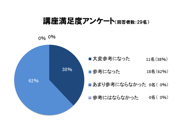 - 講師の方の話し方がうまかった。心構えの話が強かったので、実施するための具体的行動案がほしい。