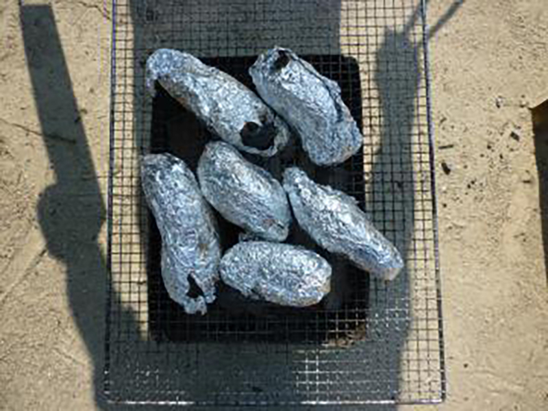 濡れた新聞紙で巻き、アルミホイルに包み、炭を起こして焼いた。