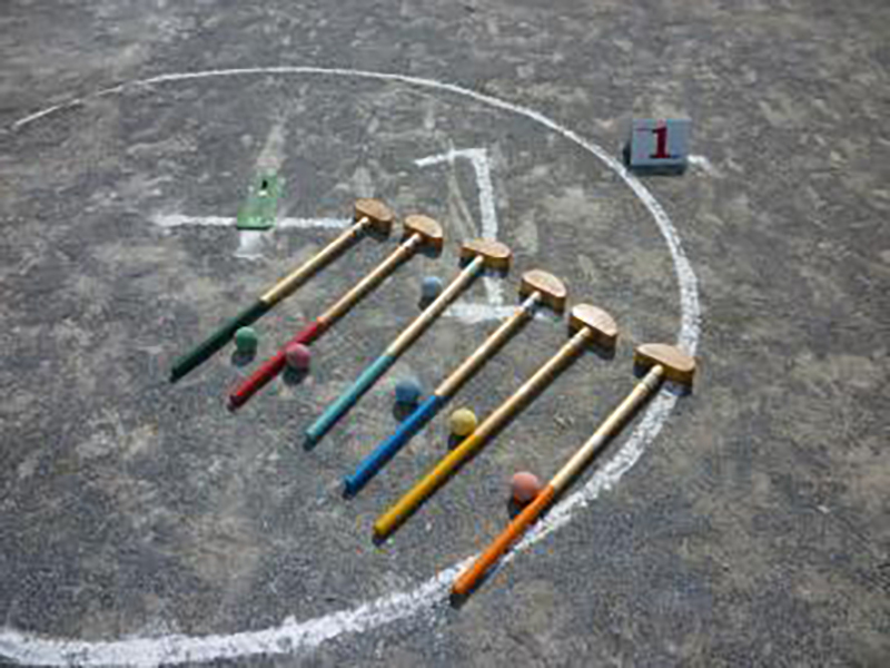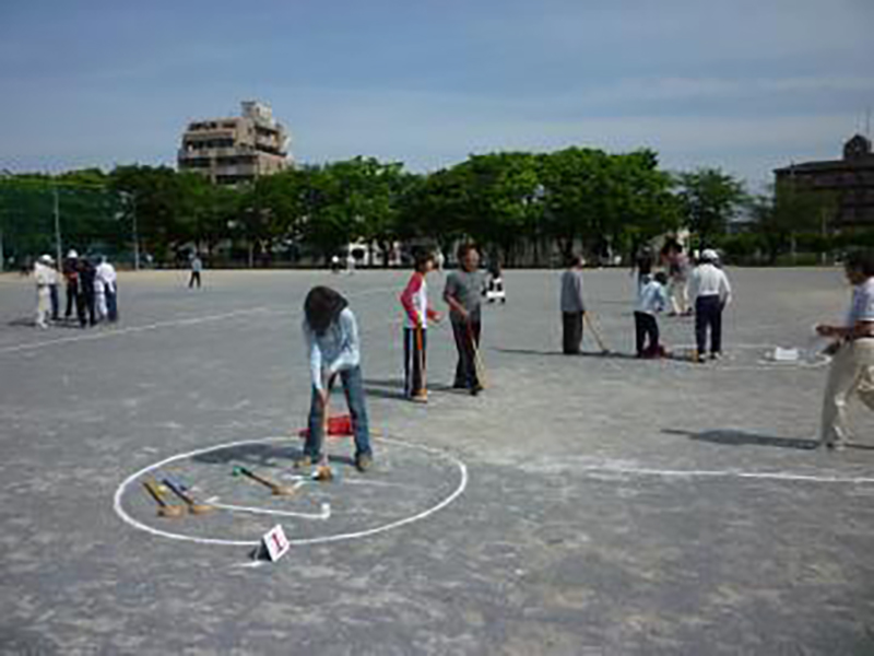 こんな道具を使って、ボールを打ち、所定の位置に入れるという、