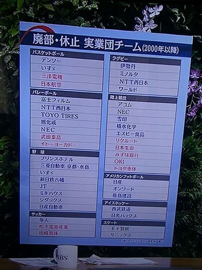 2014年07月08日(火) ブログ 実業団廃部、休止・・・ こうやって見ると、結構名門の実業団が廃部・休止になっているんですね。 効率化の名のもとに無駄を省くことの功罪の一つかな。 ~2014年7月4日WBSより
