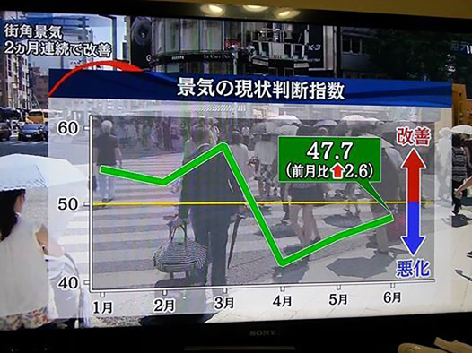 ※景気ウォッチャー調査:2000年(平成12年)から毎月、内閣府が調査し発表している景気に関する指標。百貨店・スーパーマーケット・コンビニエンスストアなどの小売店や、タクシー運転手、レジャー業界など景気に敏感な職種の人々にインタビューをし、調査結果を集計・分析した上、景気動向の指標として発表している。