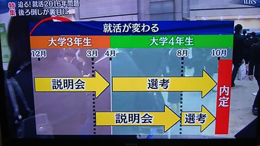 2014年08月14日(木) ブログ 就活2016年問題 就活の2016年問題。 「学生が学業に専念できるようにすること」が目的とのこと。 個人的には、大学3年の時期から就活が本格化するというのは 違和感があるんで、賛成なんだが、 ただ、ほとんどの企業が守らんだろうなぁ。 ~2014年8月11日WBSより