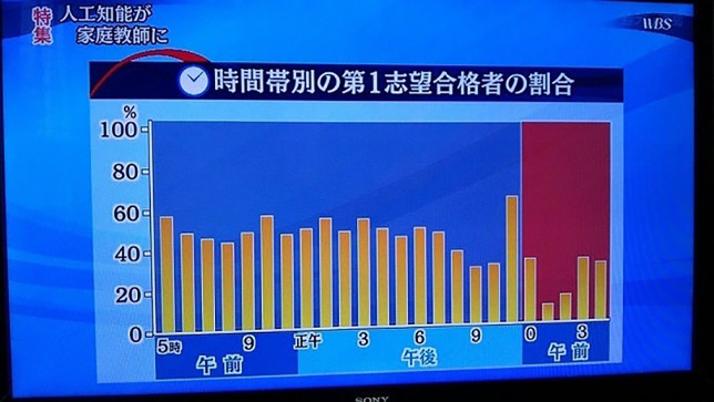 2015年02月19日(木) ブログ 時間別勉強 第1志望の大学に合格する子は、 深夜0時から3時の間に勉強する割合が低いらしい。 いや、この時間帯は、オールナイトニッポン聞いて勉強する時間帯でしょ! ~2015年2月17日WBSより