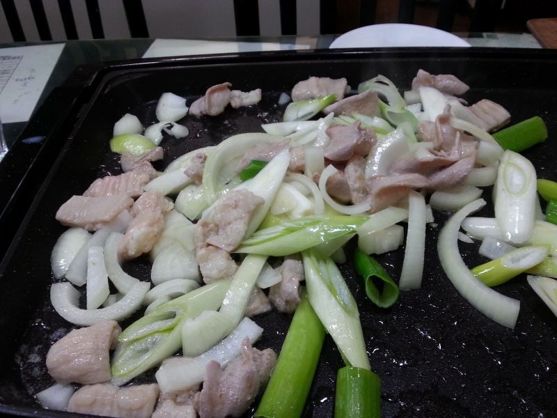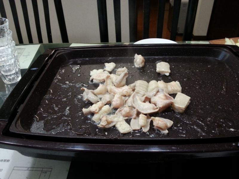 鉄板を熱し、ホルモンを焼きます。