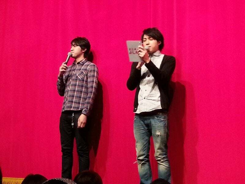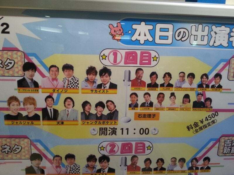 2012年01月08日(日) 経営者へのラブレター 2013年初笑い 今年も行ってきました。 ルミネtheよしもとで初笑い! しかし、なんで、生で見るとこんなに笑えるんでしょうかね? 昨年は、オープニングのBコースで度肝を抜かれ、 今年は、ジャングルポケットのネタで涙が出るぐらい笑えました。 ちなみに、前説の双子のコンビ、ダイタクも面白かった。 前説だけは写真撮影OKでしたので、掲載させてもらいます。 ちなみに、子供たちは、ジャルジャルとなだぎ武が気に入っていたようです。 新喜劇も含めて、全部面白かったです。